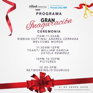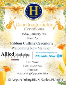 Please join us to celebrate the Grand Opening / Ribbon Cutting for our new member Allied Marketing at their new 321 Airport Road N. Naples location on Friday, January 31st from 11-2PM. Members and guests may enjoy delicious Hors d’oeuvers, champagne and mimosa toast, and live music provided by professional violinist. See below for schedule of events and details.